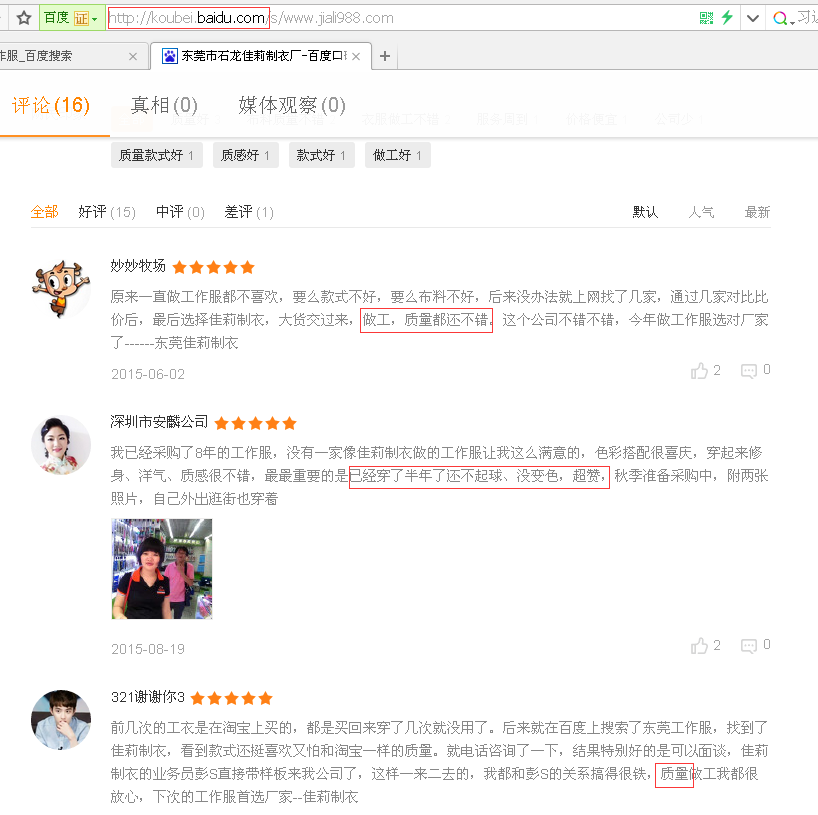 都是五星評價,這就是東莞市石龍佳莉制衣廠,在東莞地區專業從事服裝設計、生產、開發和加工服務。我們一直秉承“高起點、高標準”的管理理念,本著“質量求生存,信譽謀發展”的宗旨贏得了客戶認同。我們憑著先進的設計、精湛的工藝生產出高品質、高層次的職業服裝。