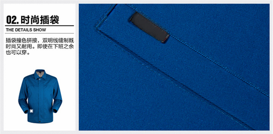 JL-QD217東莞廠服以寶藍色純色為主色,領口采用立體式翻領,外側插兜線條感十足,甄選高品質面料,讓您穿著舒服,時尚