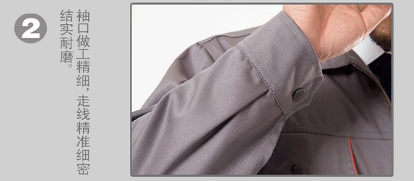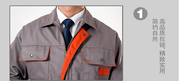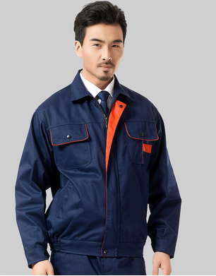 JL-QD248東莞工衣以藏藍色為主色,胸前采用橘色搭配,醒目,工業感強。前兜簡單,走線細致,實用性強。左中腰間口袋均采用雙層設計,傾斜線條,穩重大氣 。