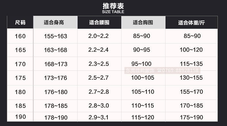 155(S)、165(M)、170(L)、175(XL)、180(XXL)、185(XXXL)、190(XXXXL)